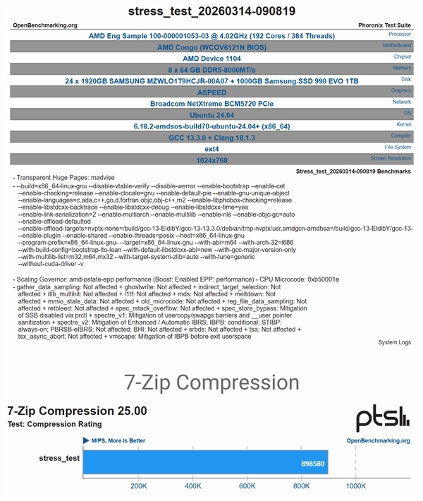 快科技3月30日消息,据OpenBenchmarking数据库信息,AMD下一代EPYC Venice(Zen 6架构)工程样品已现身测试平台,涵盖64核至192核多个配置。 本次泄露涉及三款SP7评估板,分别以非洲国家命名:Congo(刚果)、Kenya(肯尼亚)和Nigeria(尼日利亚)。 Congo平台测试了两款样品:最高端型号100-000001053-03配备192核384线程,基础频