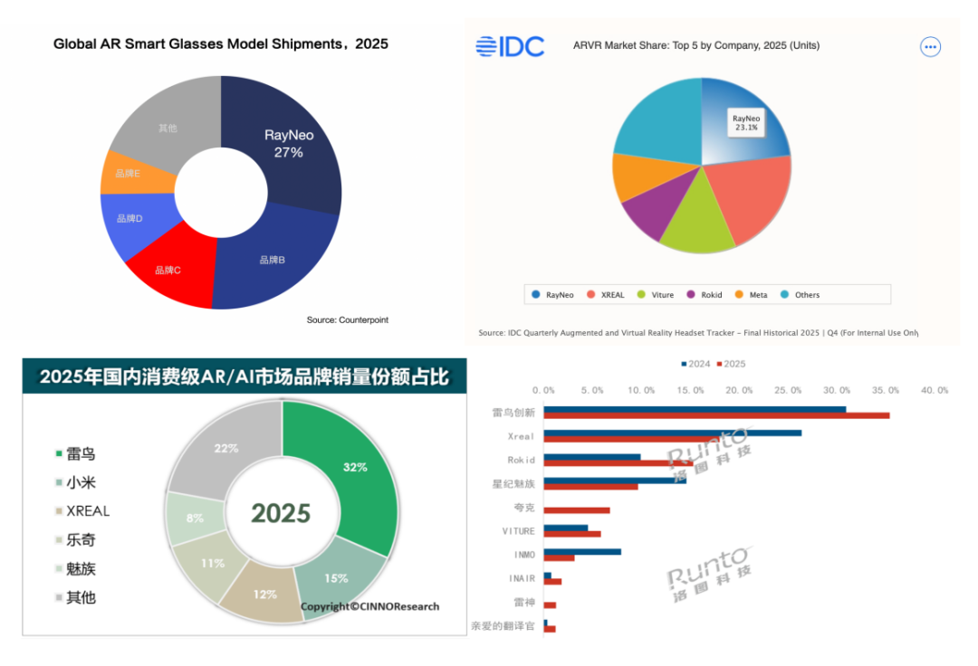 文/VR陀螺 ZJ 过去一年,智能眼镜行业在“百镜大战”与AI风口的喧嚣中迅速升温。玩家激增、概念层出不穷,但真正的竞争格局,直到最近才清晰起来。 当Counterpoint、IDC、CINNO与洛图科技四家机构相继发布2025年度报告,并给出一致结论:中国公司雷鸟创新同时拿下全球与中国AR眼镜市场第一,这场竞争的结果也逐渐明晰。 这不仅是一家公司的阶段性领先,也意味着AR眼镜,这一被视为“下一代