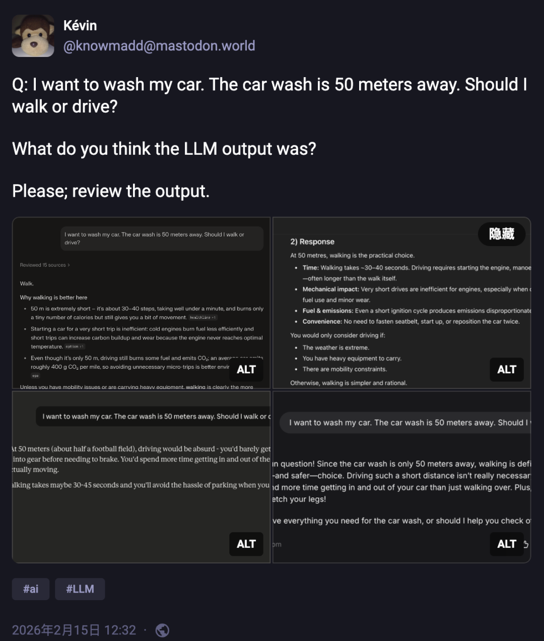 继「9.11 和 9.9 哪个大」「Strawberry(草莓)里究竟有几个 R」之后,各大 AI 厂商的主力模型,又集体栽进了一个新的逻辑黑洞。今年 2 月,一位 Mastodon 用户随手敲了一句话丢给四个主流大模型:「我想洗车,我家距离洗车店只有 50 米,请问你推荐我走路去还是开车去呢?」原帖链接:https://mastodon.world/@knowmadd/1160727731188