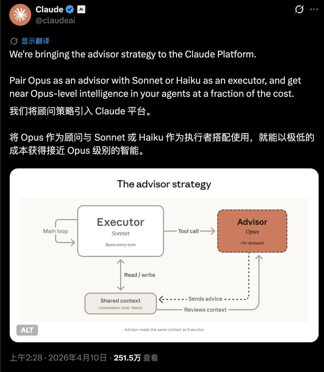 真是想游过去叫 Anthropic 别卷了,又又又又又发新功能了:Advisor 策略加入 Claude 的 API 工具箱,当 Sonnet 或 Haiku 在运行过程中遇到困难时,它会咨询 Opus 获取方案,然后继续运行,所有操作均在一次 API 请求中完成。老实说做法在开发者社区里一点都不新鲜,很多(贫穷的)开发者在自己的工作流里就是这么干的,用便宜模型处理简单任务,只在需要深度推理时才调