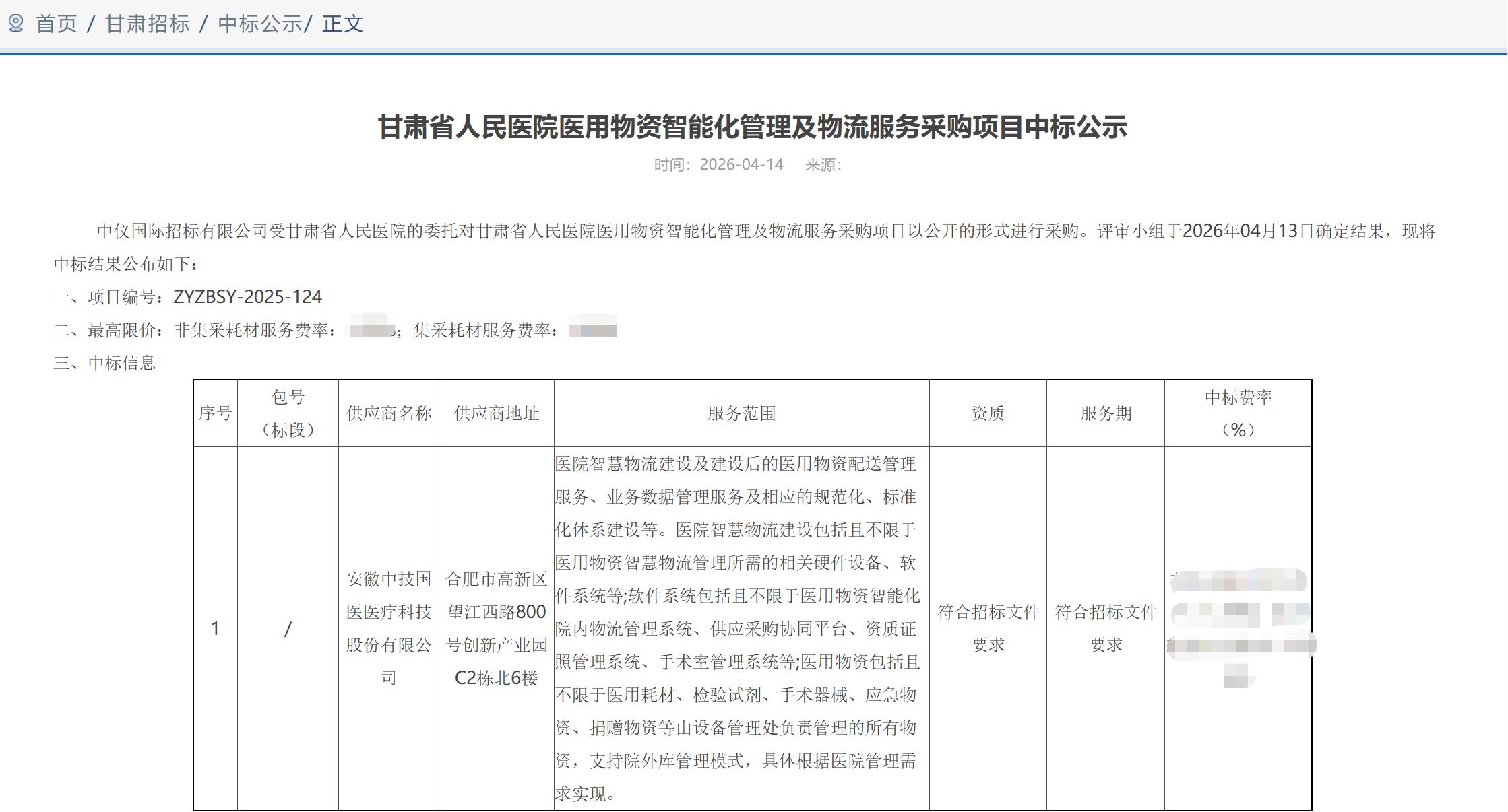 4月14日,甘肃省人民医院医用物资智能化管理及物流服务采购项目中标公示正式发布——国医科技凭借卓越的技术实力与综合方案,从激烈竞标中脱颖而出,成功中标!这标志着国医科技正式进军甘肃省医疗市场,将智慧医疗供应链解决方案引入陇原大地,助力甘肃省人民医院打造西部智慧医院标杆,实现公司在西北区域业务市场的重要突破。陇原医疗标杆 引领智慧升级甘肃省人民医院是甘肃省政府直属的三级甲等综合性医院,集医疗、科研、